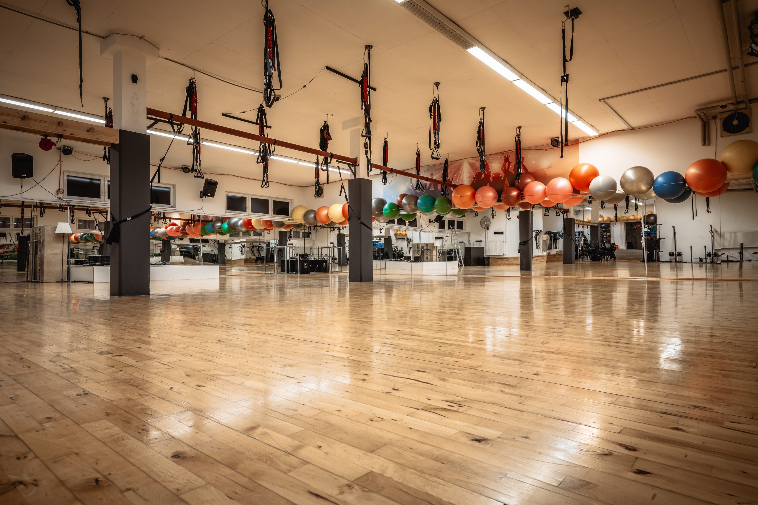 Alle Kurse mit hohem Platzbedarf oder vielen Teilnehmern finden in der großzügigen Kurshalle statt. Der leicht federnde Parkettboden schont deine Gelenke, und in den großen Spiegeln kannst du dein Training kontrollieren. Trainingsmaterial wie Hanteln und Bälle gibt es in ausreichender Zahl. Bis zu 100 Teilnehmer haben hier Platz genug zum Auspowern.